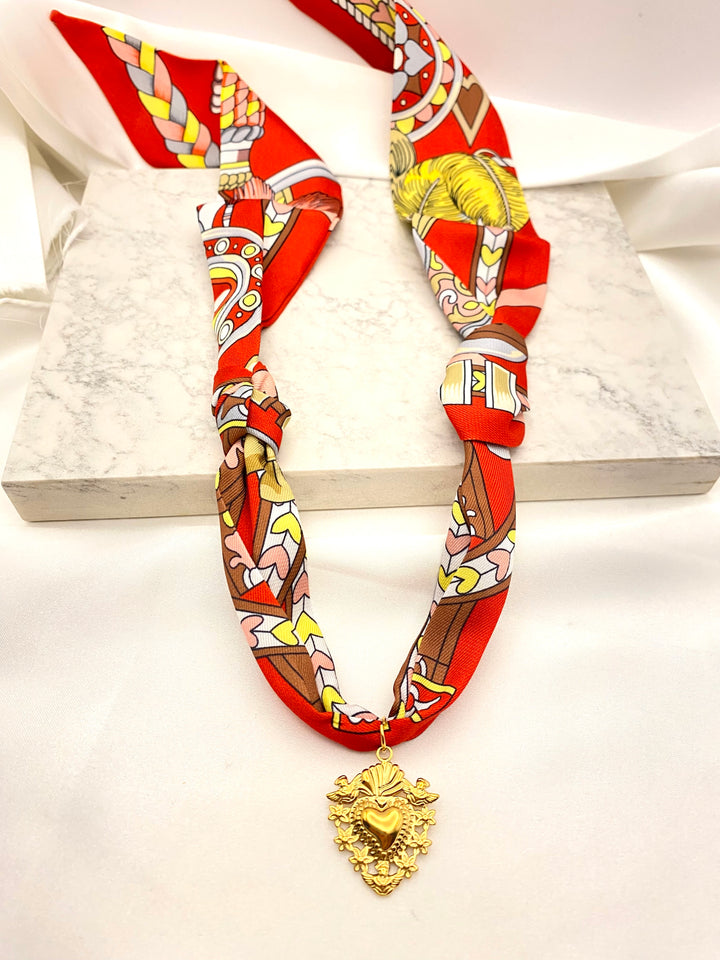 Accesorio para dama de usos varios (collar, pulsera, accesorios para bolso) de material textil y dije de Acero